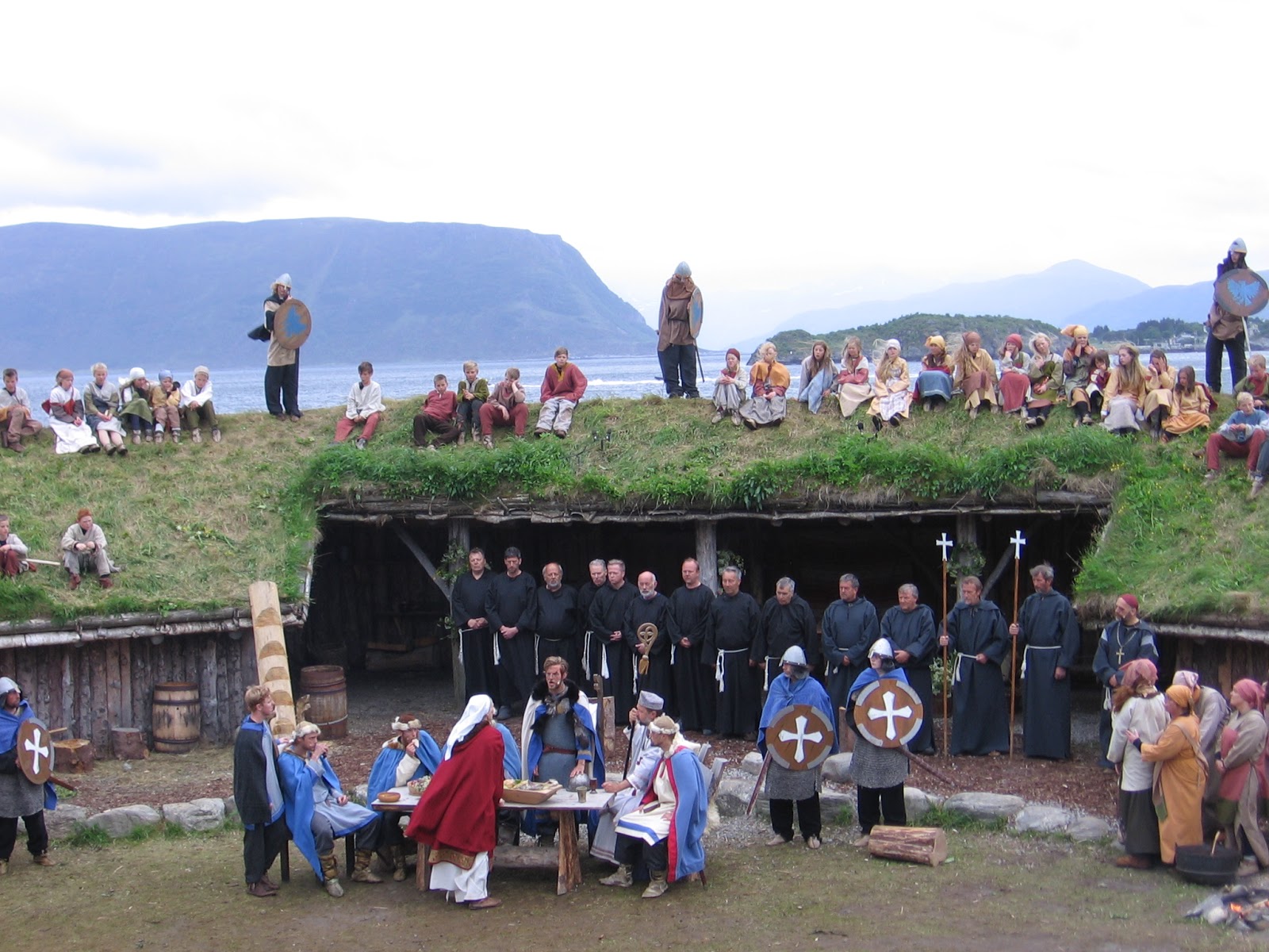 Obecni mieszkańcy Giske kultywują pamięć o swoich praprzodkach. Od 1995 roku wystawiają każdej wiosny przedstawienie, w którym wracają do czasów sprzed tysiąca lat. W organizację widowiska angażuje się mnóstwo ludzi. W tegorocznym Giskespelet, bo tak nazywa się spektakl, wystąpiło około stu pięćdziesięciu aktorów. W tym tylko troje zawodowych, pozostali to mieszkańcy Giske. Wśród nich duża grupa dzieci, najmłodsze z nich ma dwa (!) lata. Króla zagrał Tobias Santelmann - który ma w swoim dorobku rolę w słynnym norweskim kandydacie do Oskara - Kon -Tiki. Przedsięwzięcie zorganizowane z rozmachem. Wyobrażam sobie, ile pracy trzeba włożyć w samo przygotowanie kostiumów.